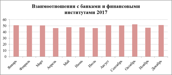 В первом квартале этот показатель находился в положительной зоне оценки, затем произошло снижение значения до минимального – 46,2 пункта. В апреле-августе индикатор «взаимоотношения с банками и финансовыми институтами» оставался примерно на одном уровне. В августе – октябре он смог снова пересечь пороговое значение 50 пунктов и достичь максимума за последние три года – 52,3 пункта. В ноябре произошёл отскок до значения 46,9 пункта, оказавшийся кратковременным, и в декабре он прибавил 4,3 пункта до значения 51,2 пункта.